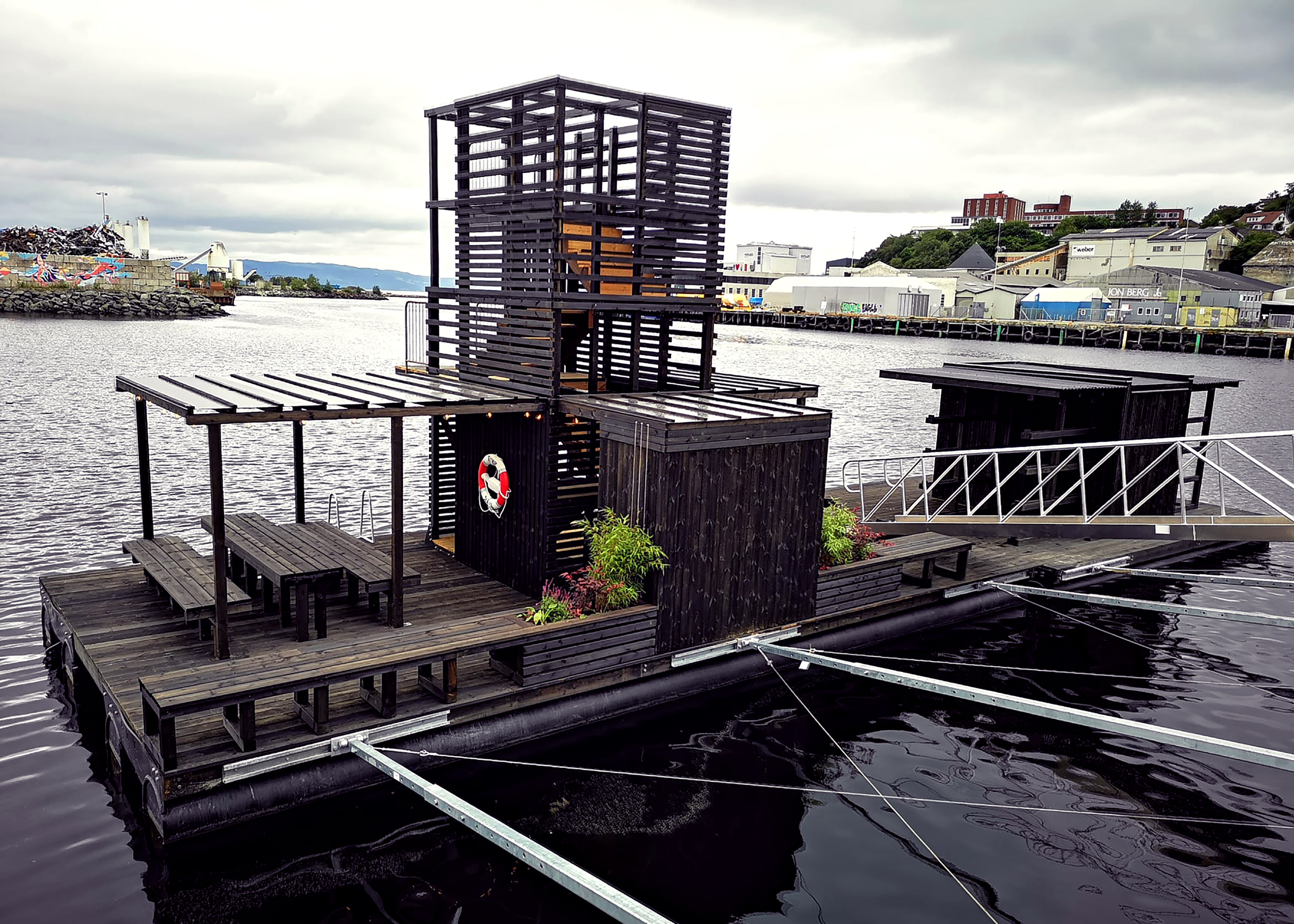 ARK Trondheim is a part of a large urban development scheme in Nyhavna. We have developed and delivered a floating village which measures 400 square meters. It boasts four public saunas, a Russian inspired banja, one bathtub inspired by the Japanese Onsen, as well as a salt water pool, bar and reception, shower, bathing jetty, kayak raft, and a diving tower with a height of 3 and 5,5 meters.
